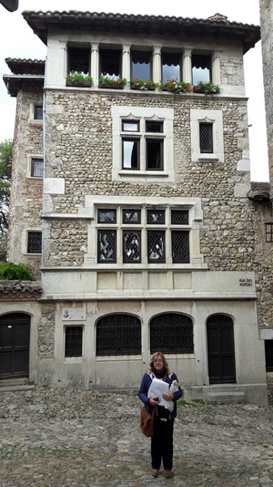 Tutti insieme facciamo subito un giretto per visitare il borgo mantenuto in buonissimo stato: passiamo attraverso un antico portale, non ci sono mura che contornano il paese, le vie sono di sassi arrotondati e ben levigati dalla moltitudine di gente che li ha calpestati in centinaia di anni. Le case di pietra risalgono sì al periodo medievale, ma con ritocchi durante il periodo Napoleonico, comunque bellissima la grande piazza e ovunque segni del tempo come l’antico torchio, il mulino, il lavatoio. La casa dove si terrà l’incontro con gli autori è detta Mac: maison des arts contemporaines ed è un’antica dimora su tre piani e un seminterrato.