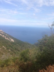 Ci incamminiamo per il sentiero dove la freccia dice: eremo di San Bartolomeo. Man mano che saliamo, accidenti proprio ripido, il paese di Chiessi si allontana e si allarga la veduta della baia. Notiamo dei terrazzamenti in disuso, un tempo coltivati a vitigni. Attraversiamo zone bruciate dove alcuni alberi carbonizzati non hanno né parole né chiome per salutarci. Ci sorpassa un ragazzo atletico che saltella sul sentiero come uno stambecco.